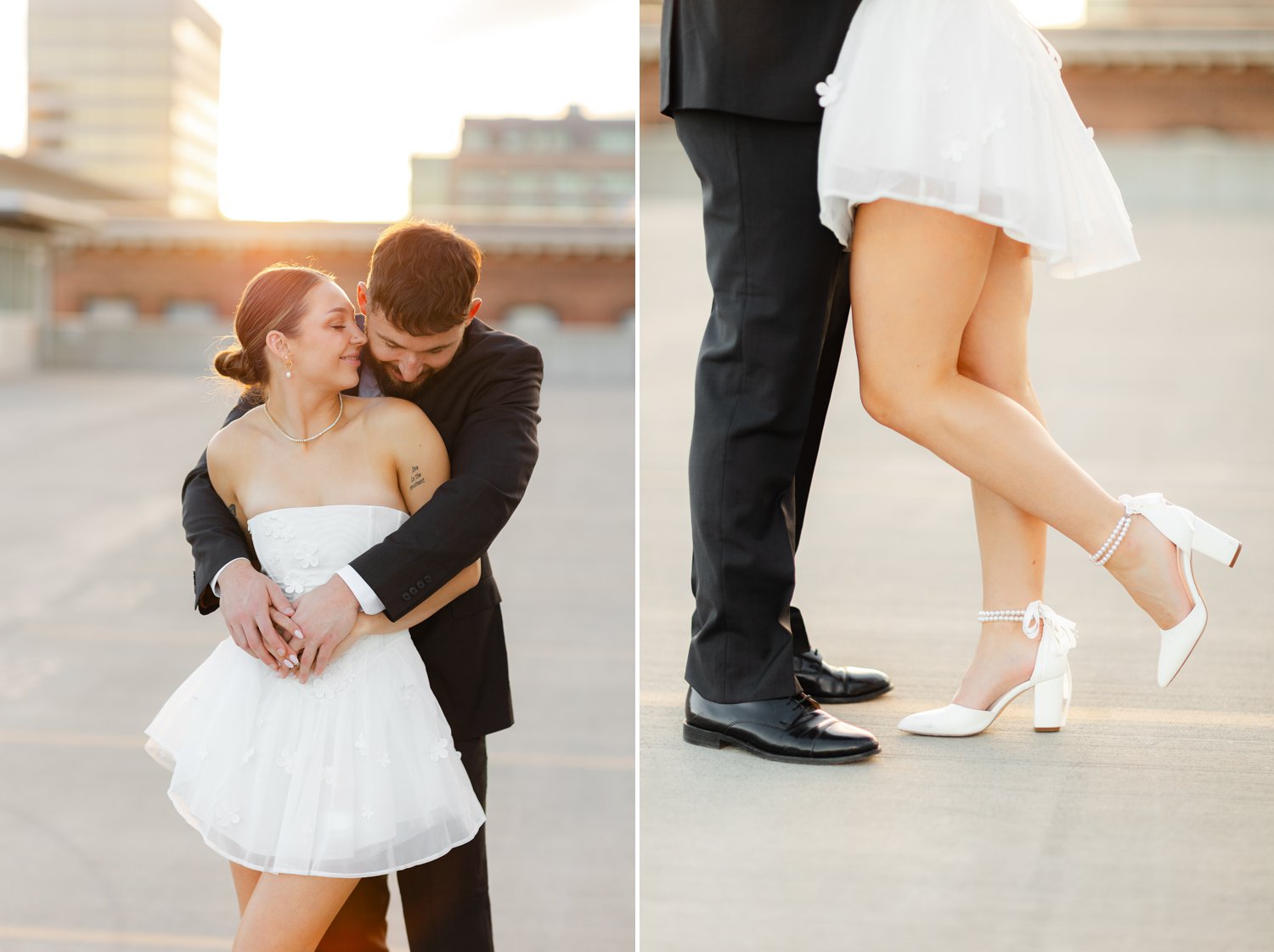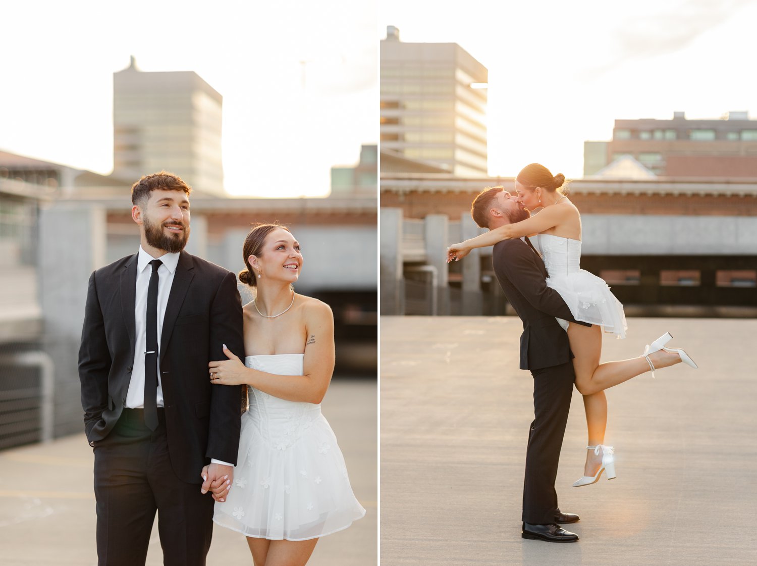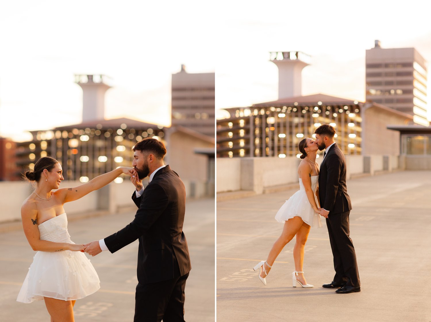 The second part of our session took us to a stunning rooftop at sunset. The warm golden hour light provided the perfect backdrop for some truly magical moments. The skyline of Spokane created an elegant and urban feel, which made this engagement session one for the books. The playful and loving energy between the couple was infectious. And the sunset’s glow added a romantic touch to the photos.