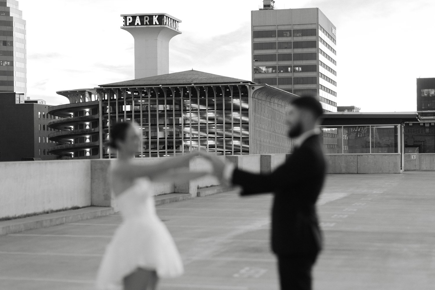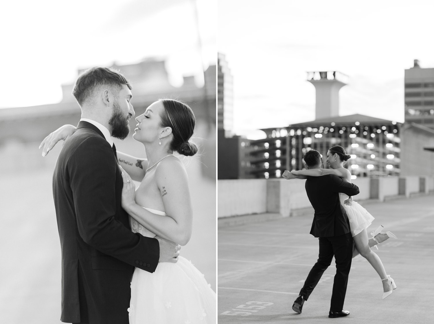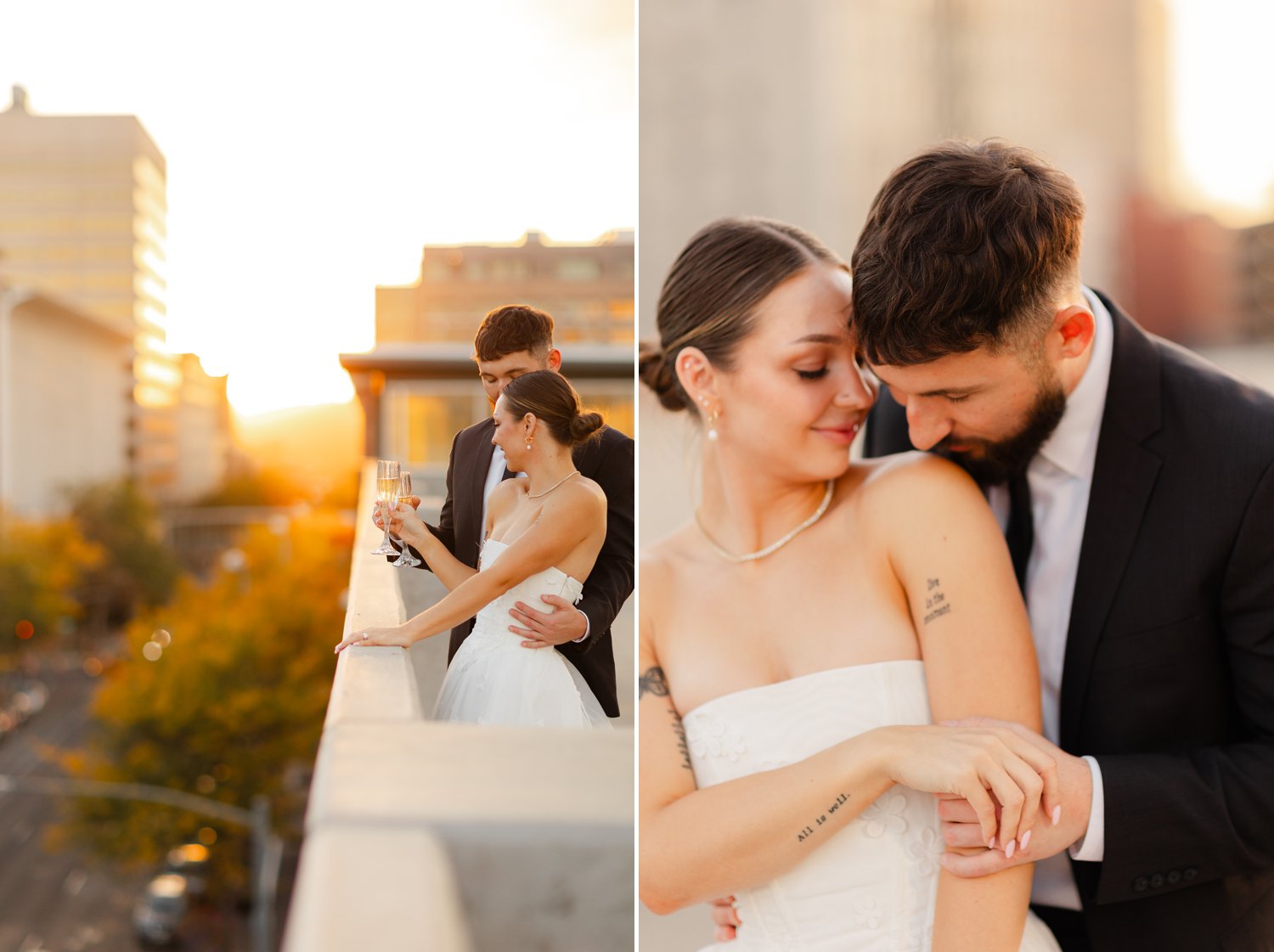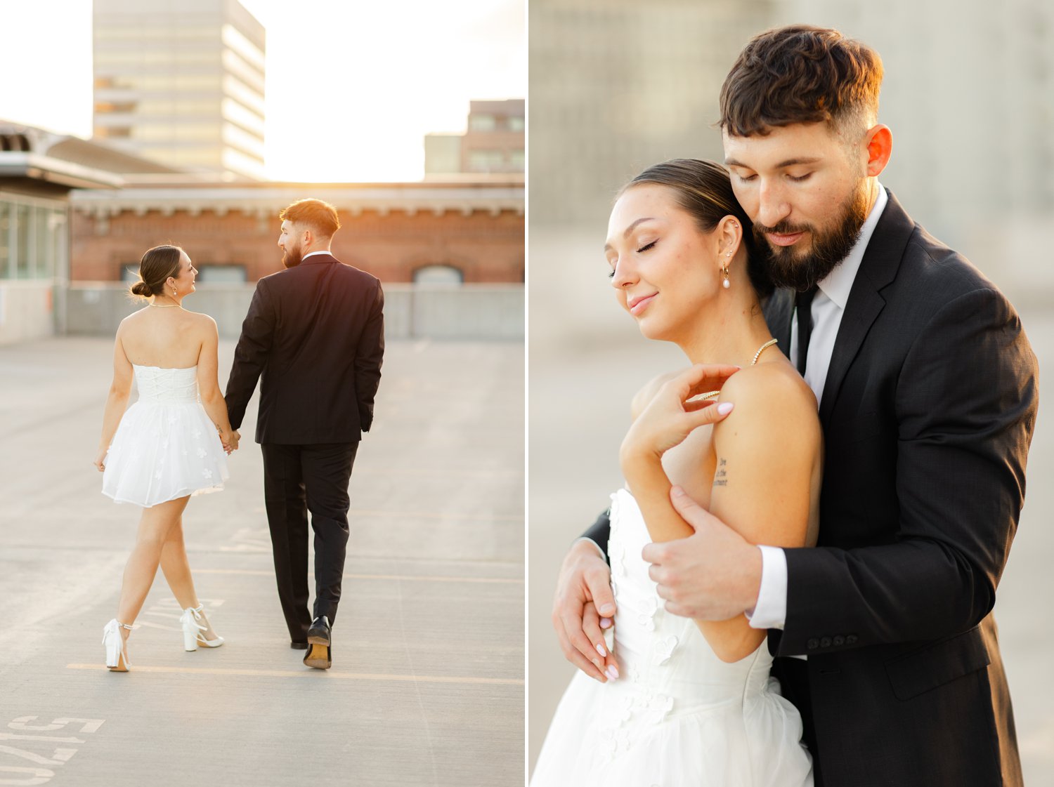 The second part of our session took us to a stunning rooftop at sunset. The warm golden hour light provided the perfect backdrop for some truly magical moments. The skyline of Spokane created an elegant and urban feel, which made this engagement session one for the books. The playful and loving energy between the couple was infectious. And the sunset’s glow added a romantic touch to the photos.