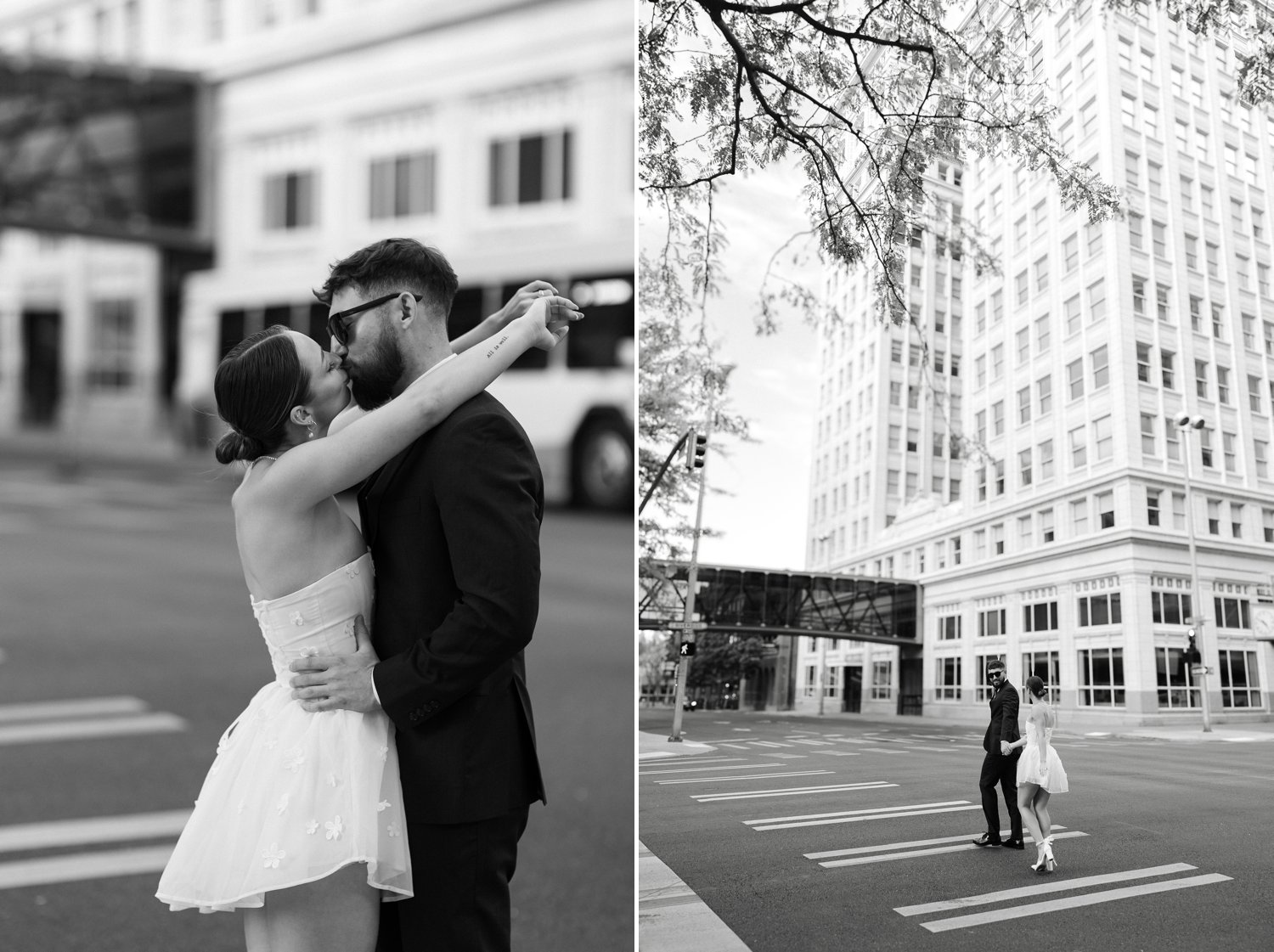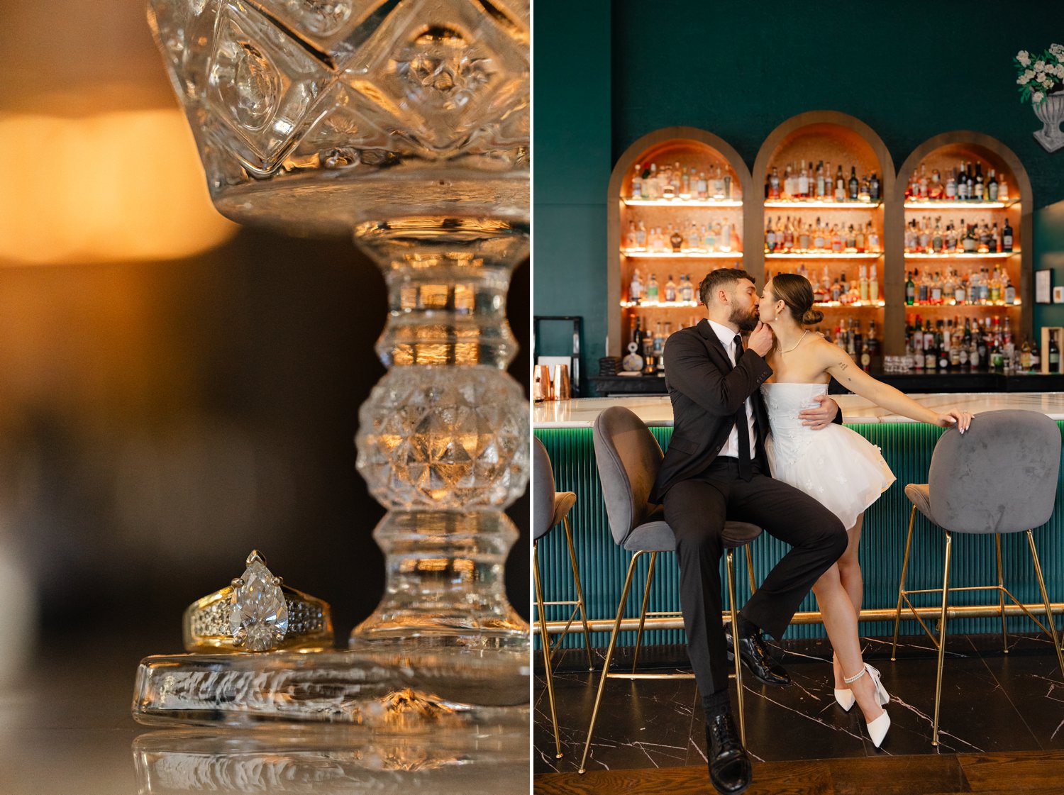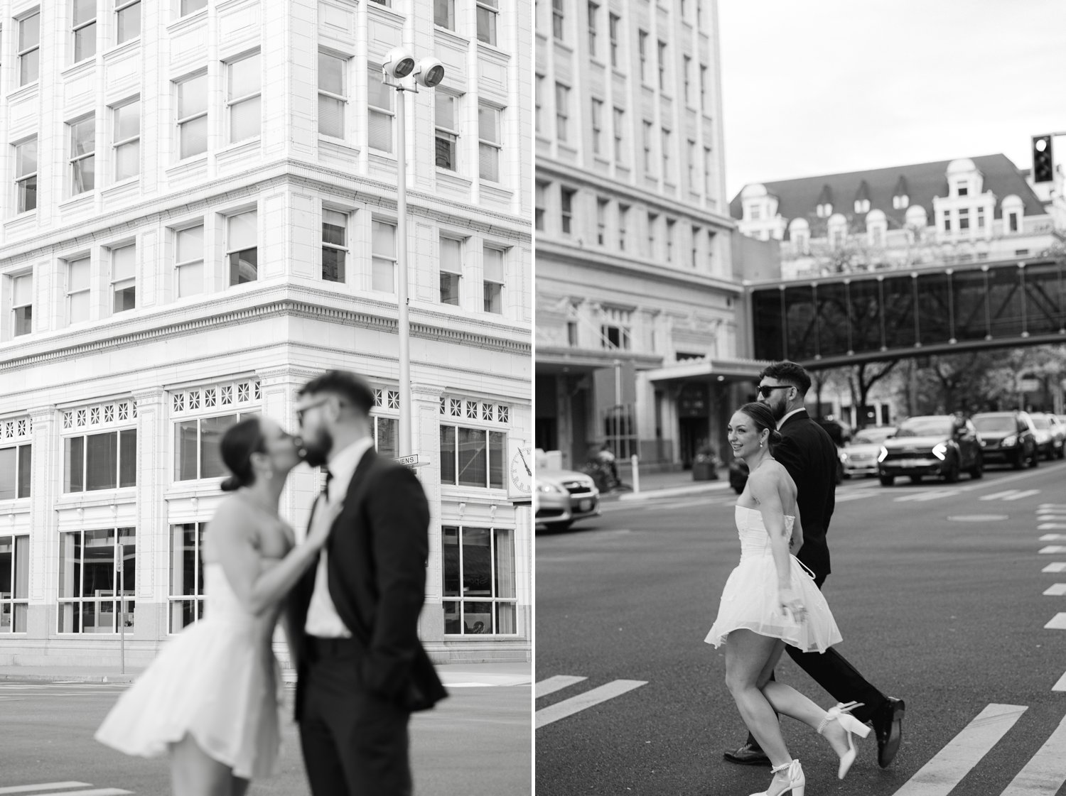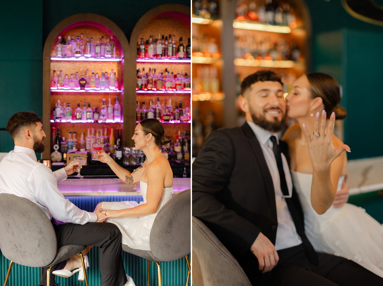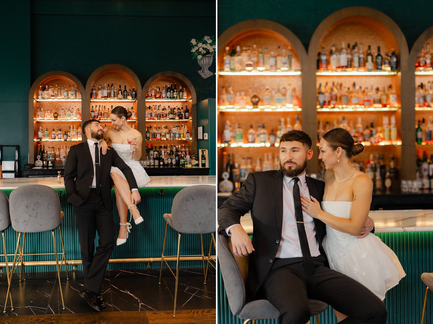 As a Spokane photographer, I have the incredible opportunity to capture love stories in some of the most beautiful locations around the city. This recent engagement session in downtown Spokane was particularly special. We started at the couple’s favorite bar. It’s a chic and cozy spot where they love to unwind and enjoy each other’s company. It was such a joy to capture them in their element, sharing laughs and clinking cocktails.